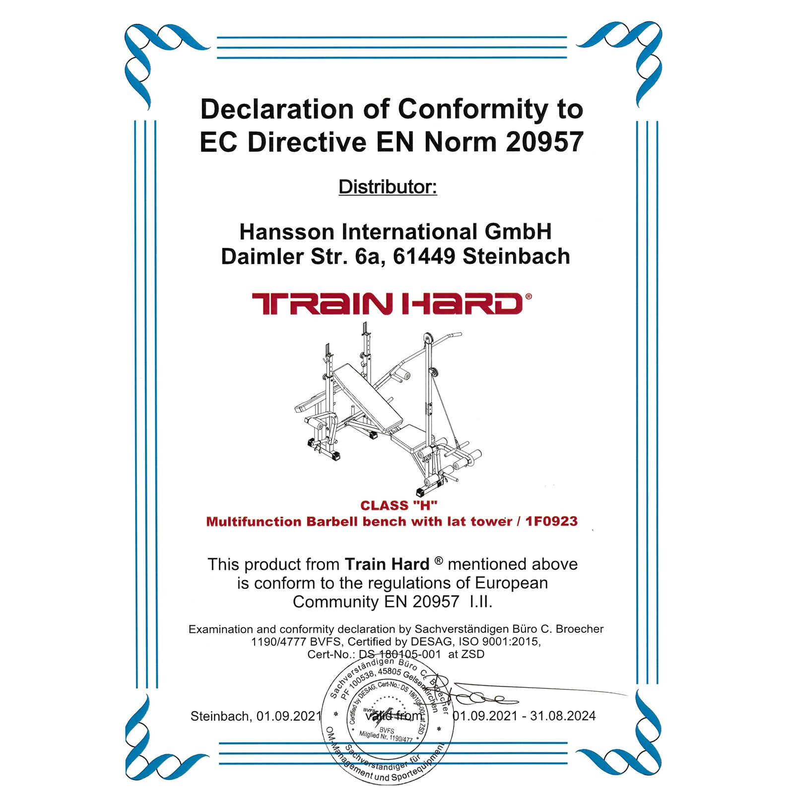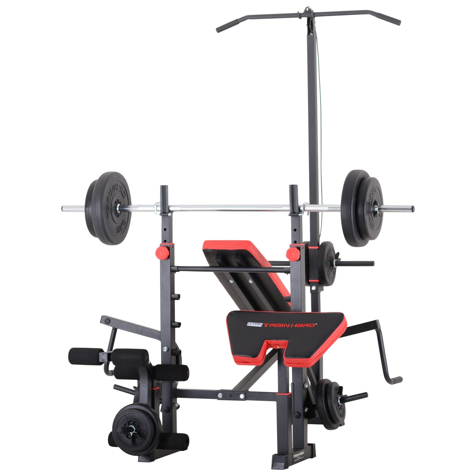 - Train Hard Multifunktionelle Hantelbank mit Langhantelablage, Arm- und Beincurl, Butterfly und Latzug.