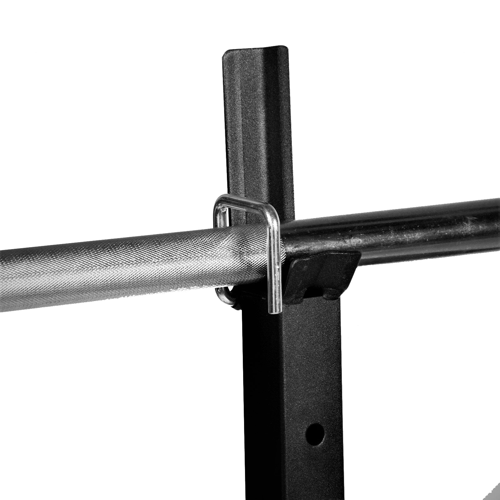- Langhantelablage mit Sicherungsbügel, maximal bis 100 kg belastbar, Höhe 6 fach verstellbar: 94 cm bis 127 cm.