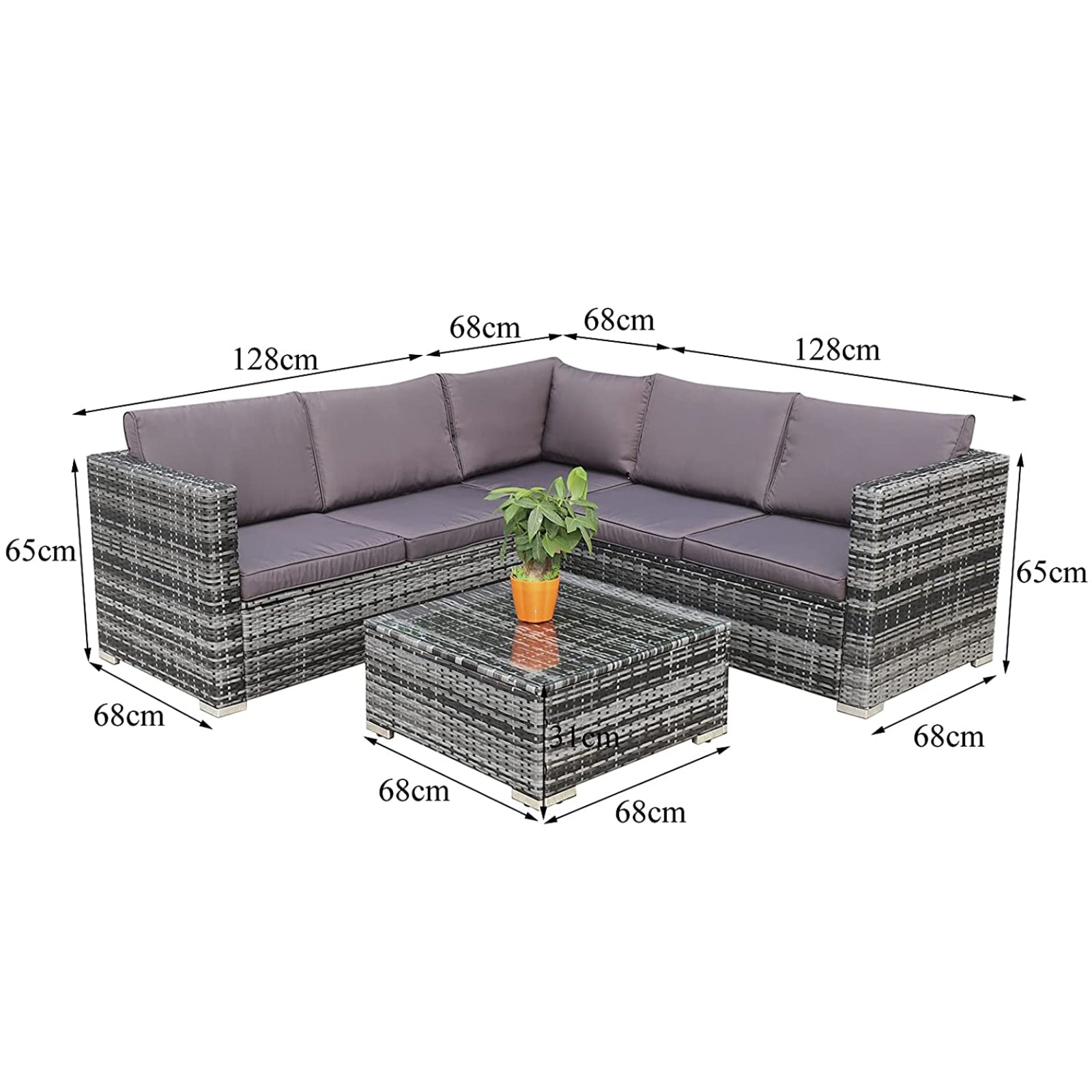 - Maße, Ecksofa: 68 x 68 x 64 cm, Doppelsofa: 128 x 68 x 64 cm, Tisch: 60 x 60 x 28 cm.